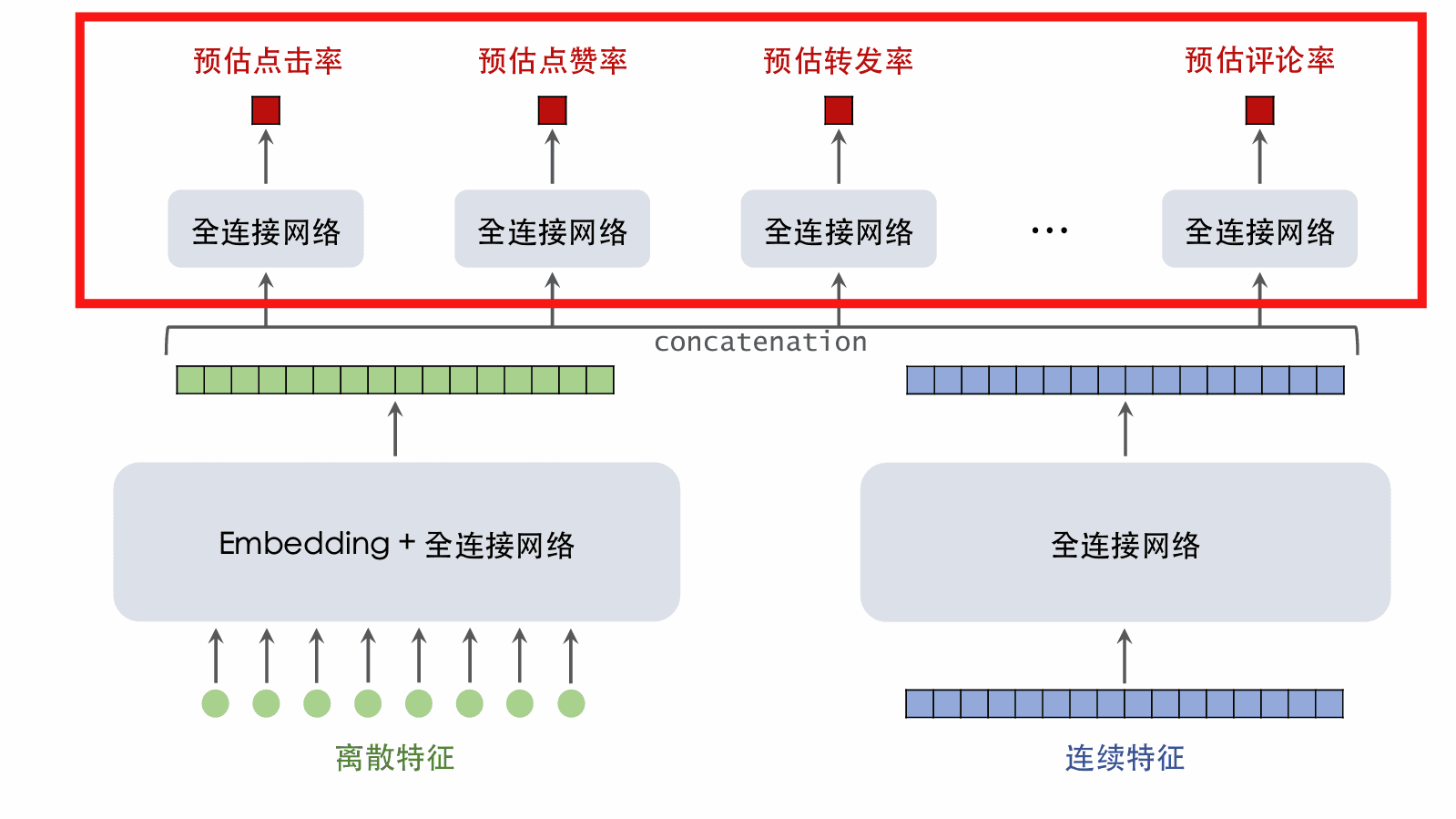 - 基座的输入包括离散特征和连续特征,输出一个向量,作为多目标预估的输入。